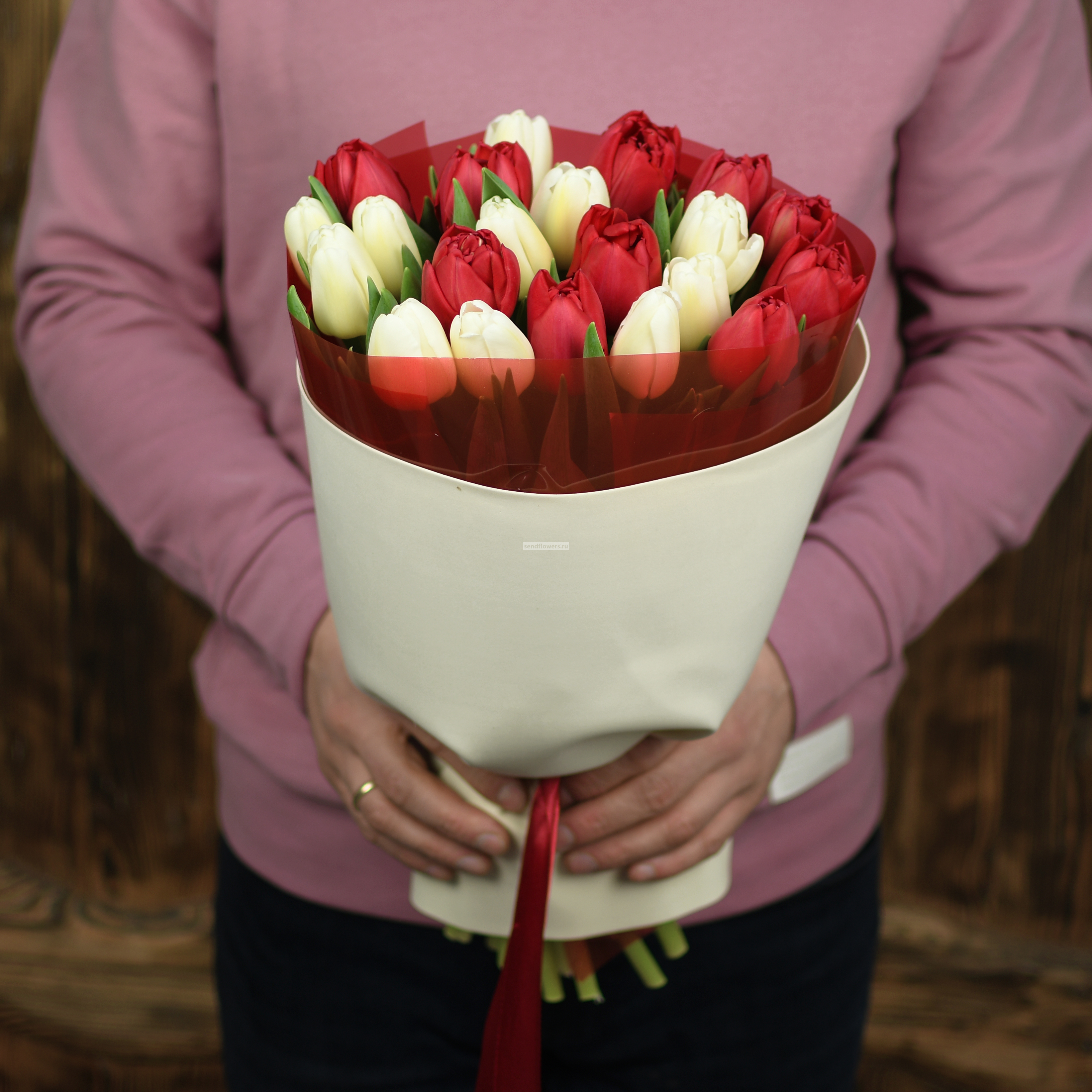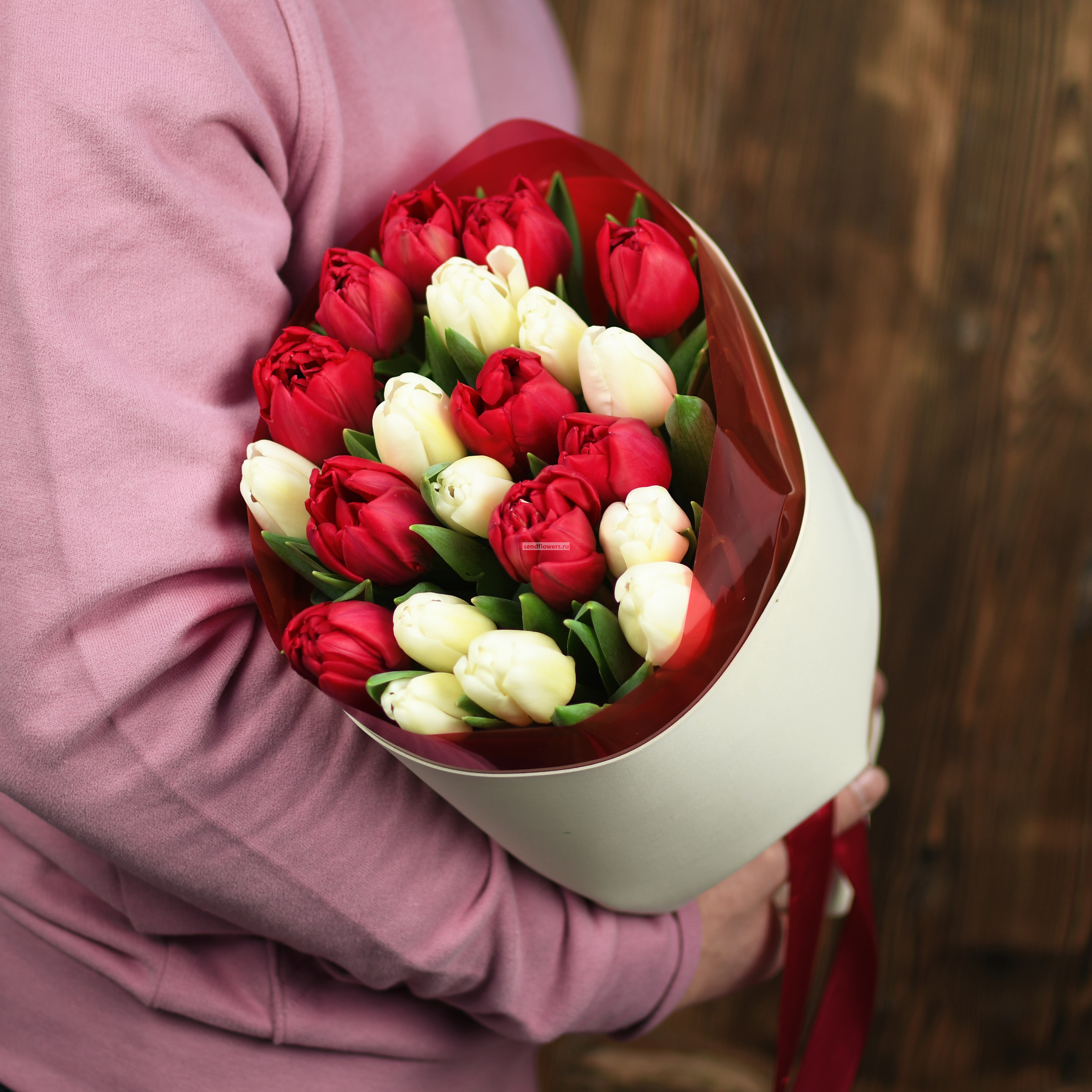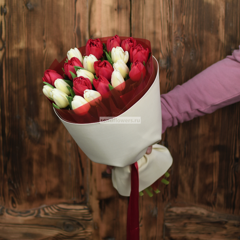 Состав: тюльпаны красные пионовидные - 10 шт., тюльпаны белые - 11 шт.