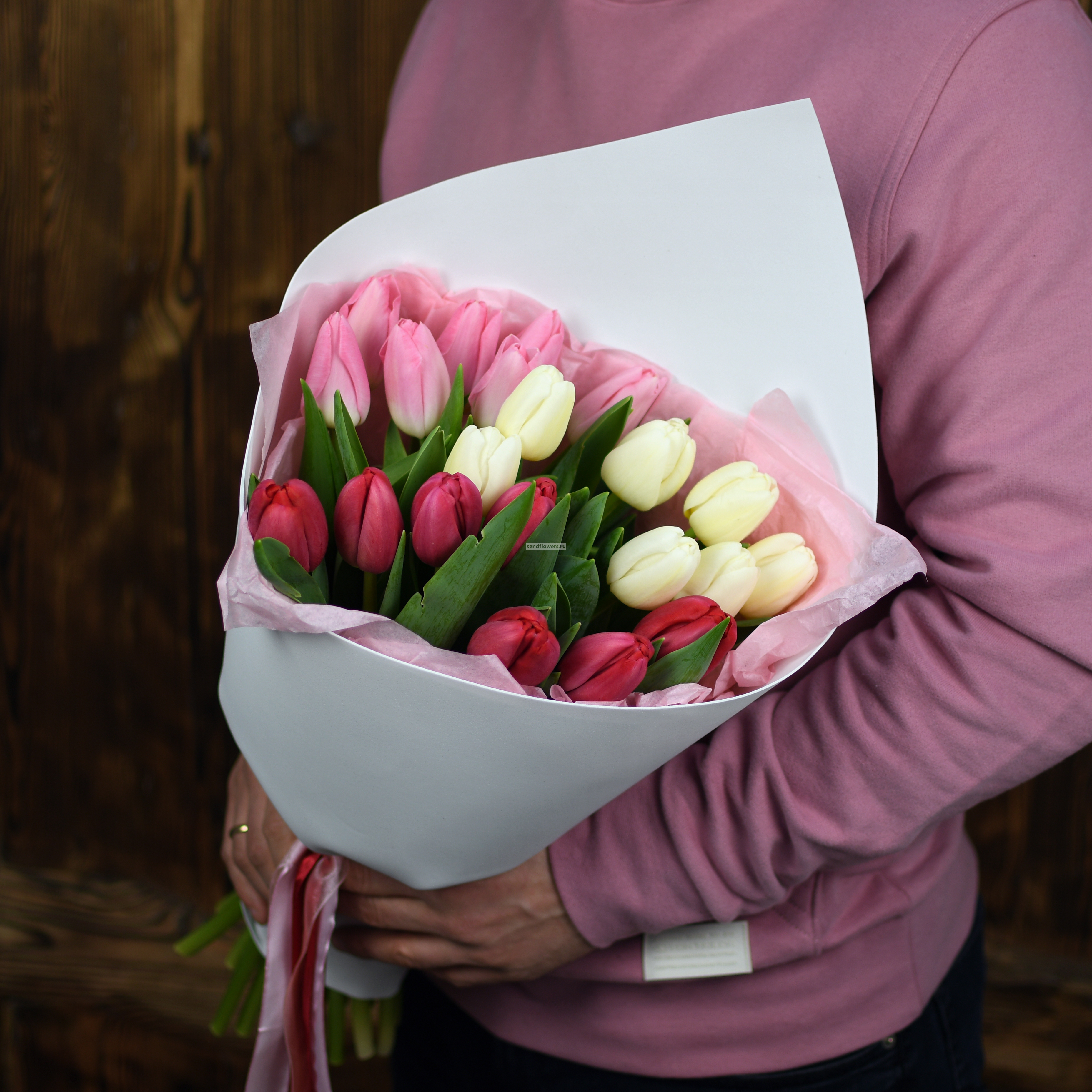 Состав: Красные, розовые и белые тюльпаны 21 шт.